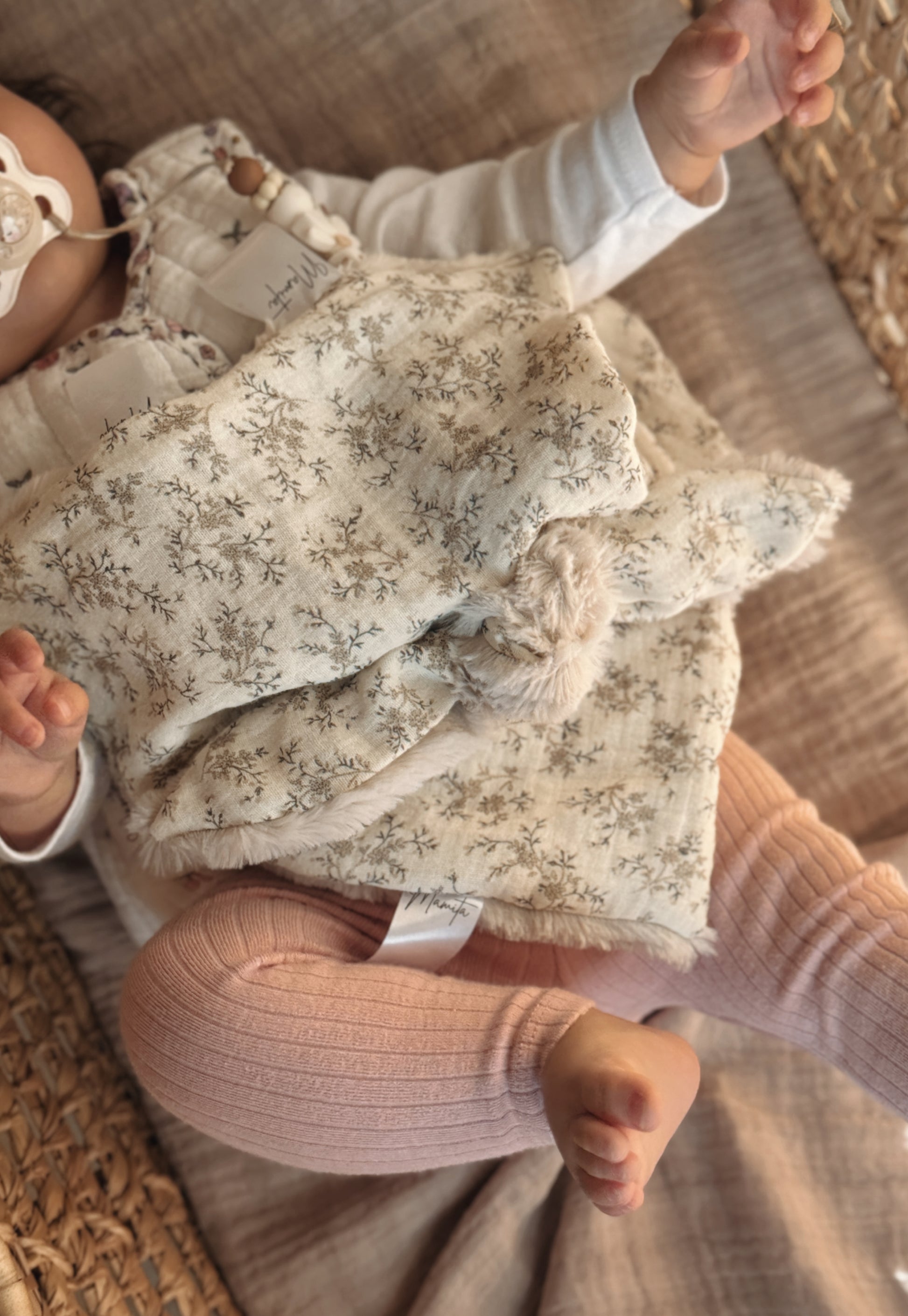 Doudou lapin tout doux – coton fleuri & fourrure beige 🤍