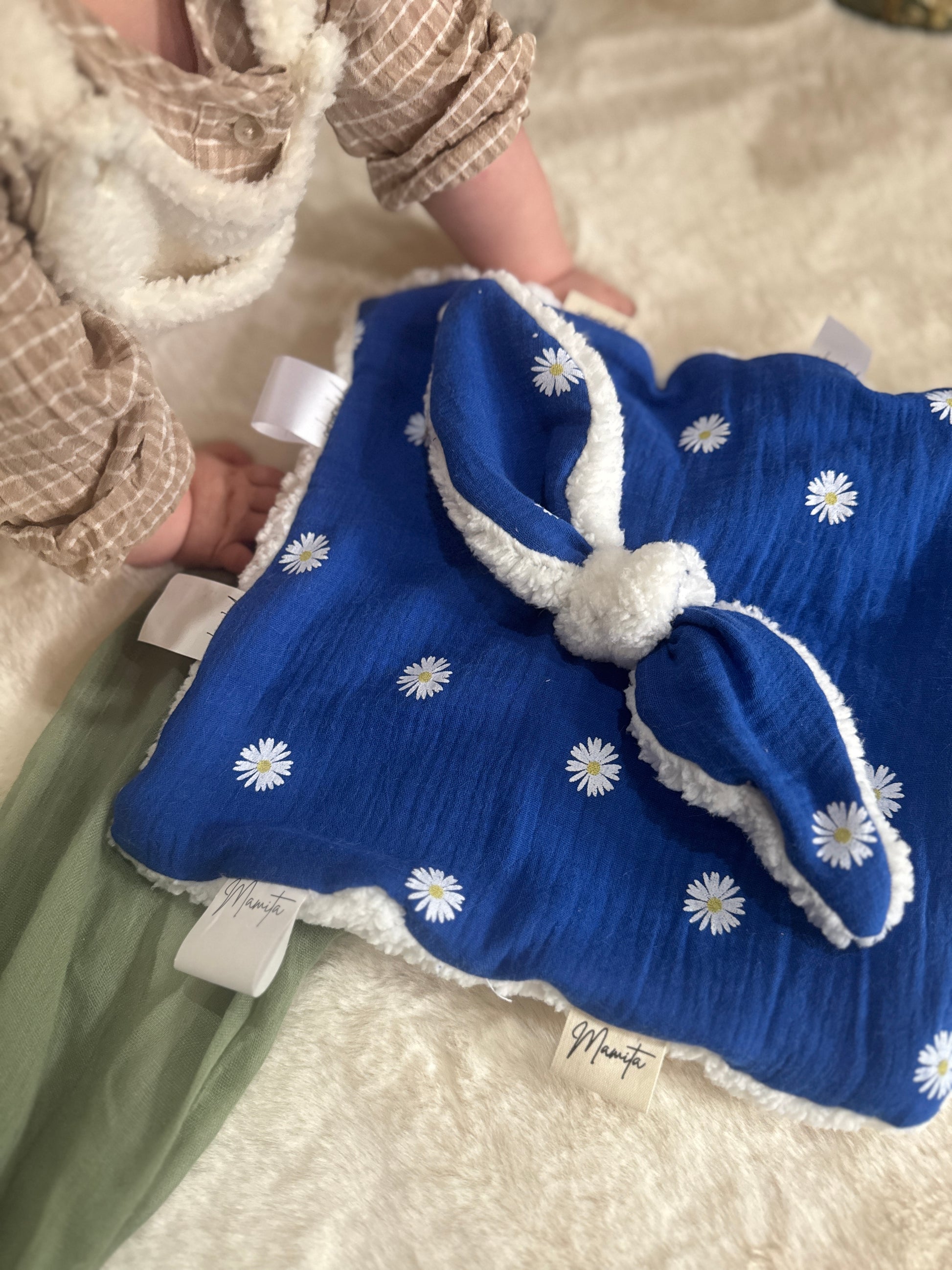 Doudou lapin tout doux – coton pâquerette bleu & sherpa blanche 🤍